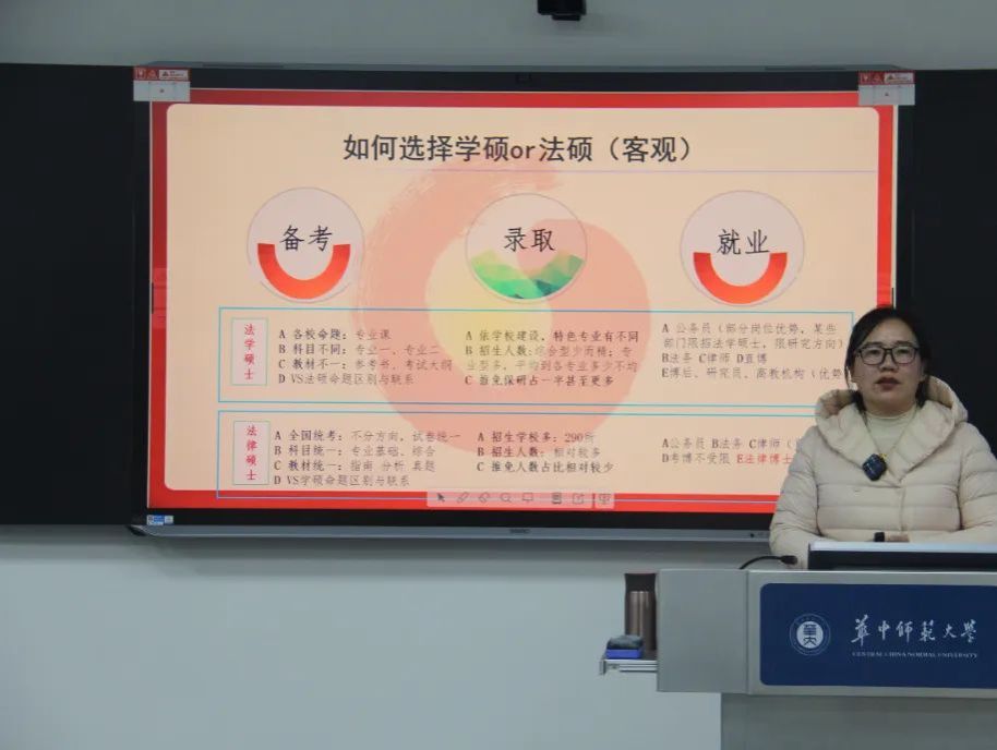 为了帮助学生们更好地规划和准备研究生入学考试,灋行生涯规划与学习发展中心于2月28日在102教室组织了专题指导讲座。此次讲座特别邀请了元照读书馆资源中心主任廖雯萍作为主讲嘉宾,她从“战略定位-目标选择-竞争分析-备考策略-实战突破”这一逻辑链条出发,全面而系统地解析学硕与法硕培养之间的差异、院校梯度选择的方法论、专业课命题的规律以及法考与考研协同备考的方案等核心问题。互动环节,同学们就择校和备考的疑问与老师进行交流。