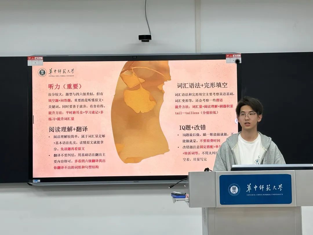 3月26日晚,灋行生涯规划与学习发展中心于星空(中国)102教室举办“学长学姐说之英语学习经验分享会”。活动特邀本科生赵炜楷、祝振豪担任主讲,围绕英语学习方法与应试技巧展开系统指导。两位同学详细解析四六级备考策略,从日常积累、题型攻克、时间管理等维度分享实用经验,并通过典型案例剖析进行现场答疑,传递了英语学习的实用方法。