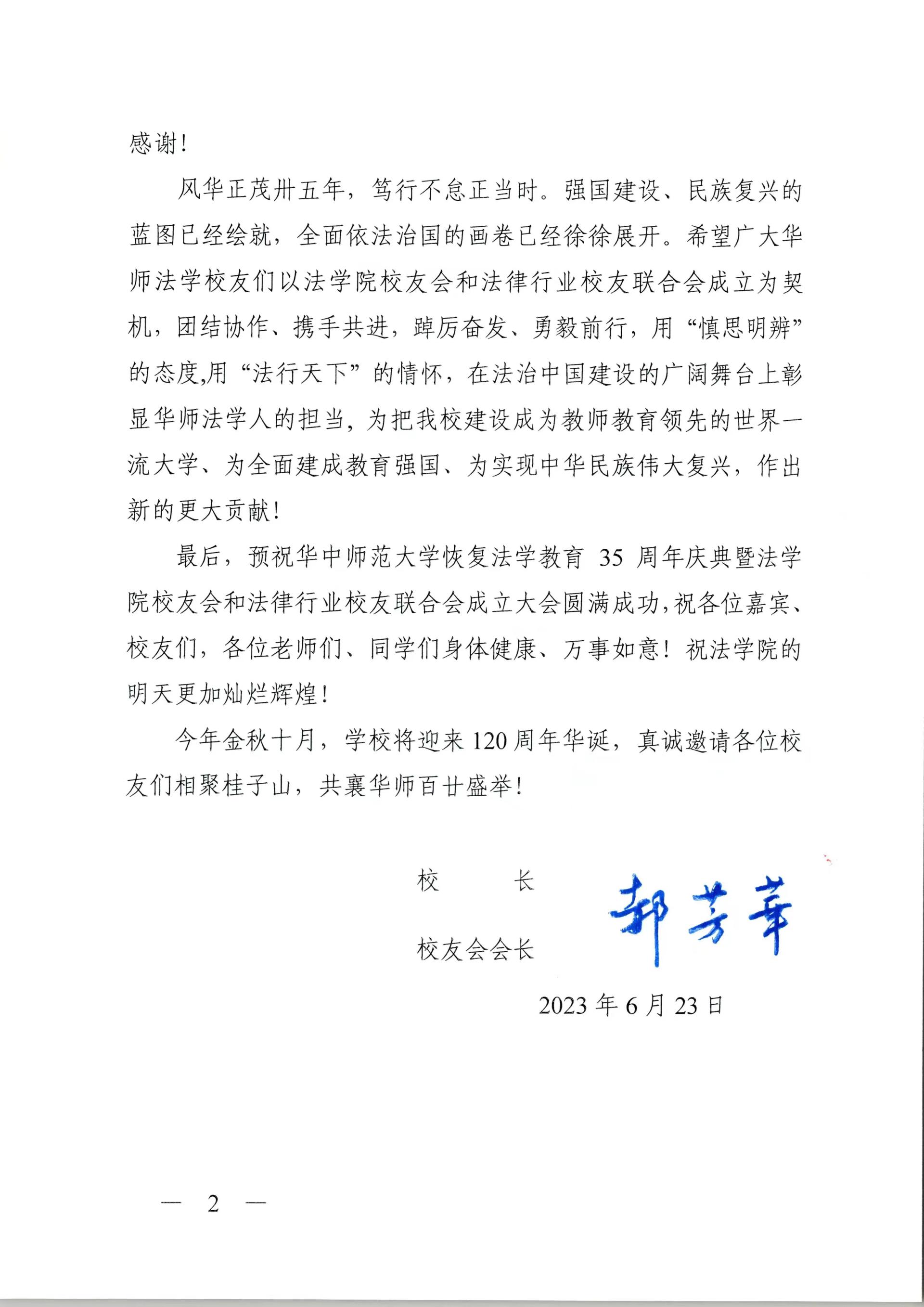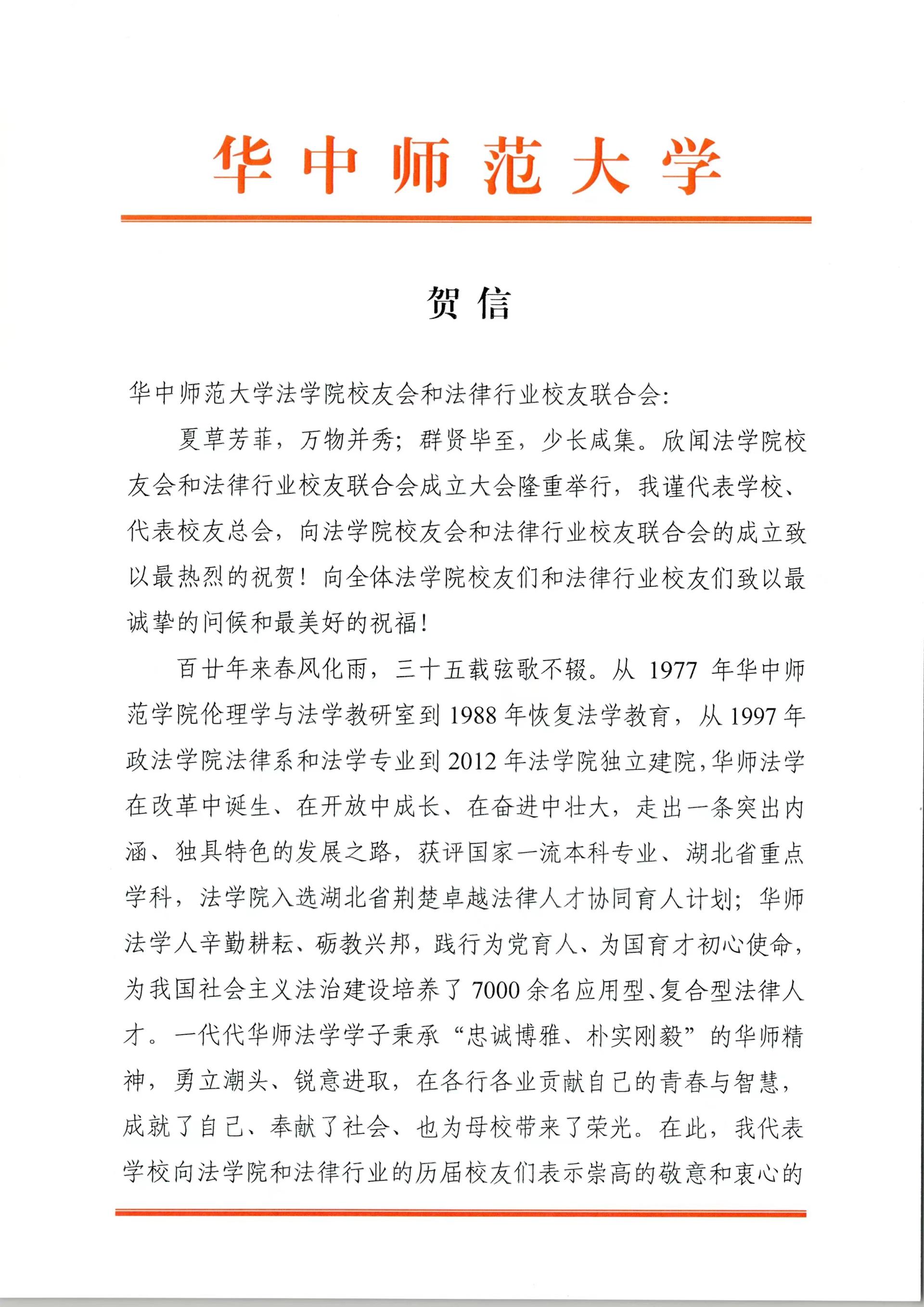 在贺信中,郝芳华代表校友总会向星空(中国)校友会和法律行业校友联合会的成立表示祝贺,向全体校友致以诚挚问候和美好祝福。她希望广大华师法学校友们以星空(中国)校友会和法律行业校友联合会成立为契机,团结协作、携手共进,踔厉奋发、勇毅前行,用“慎思明辨”的态度,用“法行天下”的情怀,在法治中国建设的广阔舞台上彰显华师法学人的担当,为把我校建设成为教师教育领先的世界一流大学、为全面建成教育强国、为实现中华民族伟大复兴,作出新的更大贡献!