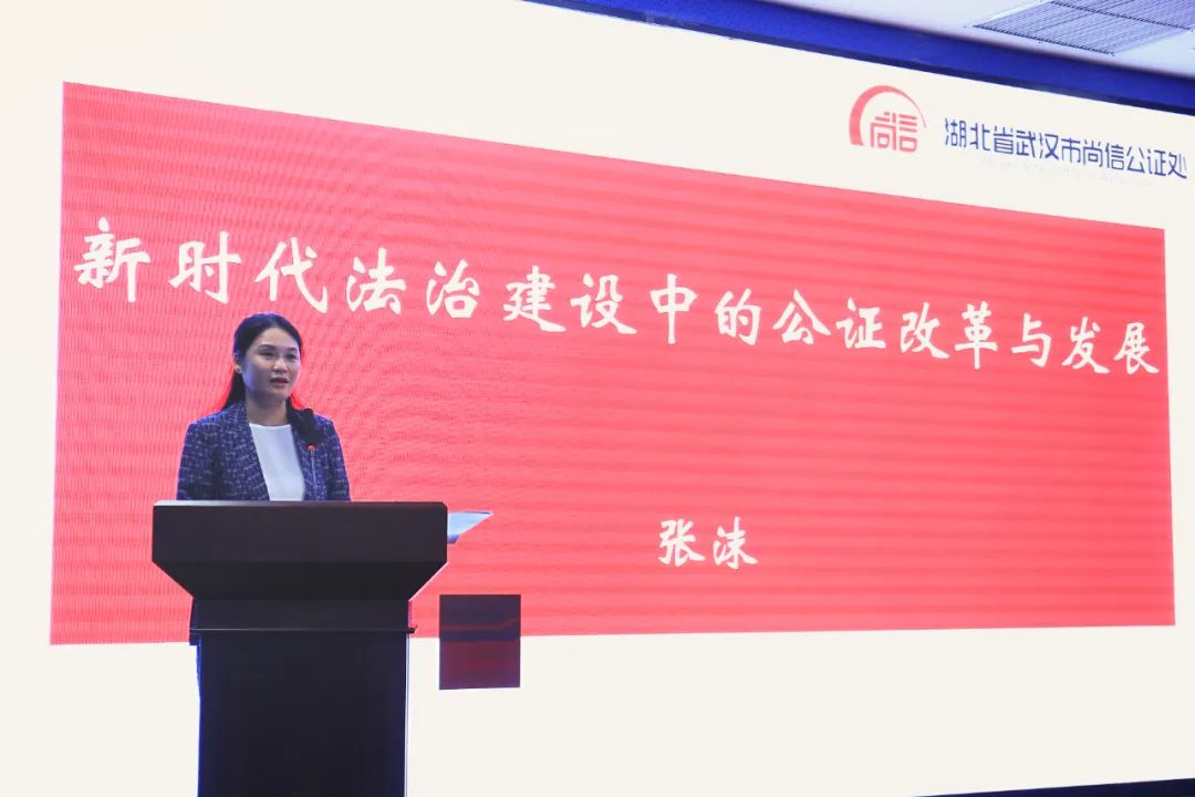 武汉市尚信公证处主任张沫作题为《新时代法治建设中的公证改革与发展》的主旨发言。她总结了新时代法治建设中的公证改革与发展,提出要坚持在法治的前提下推进改革工作,探索公证参与法治中国建设的特色之路,建立高效的公证人才体系等观点。