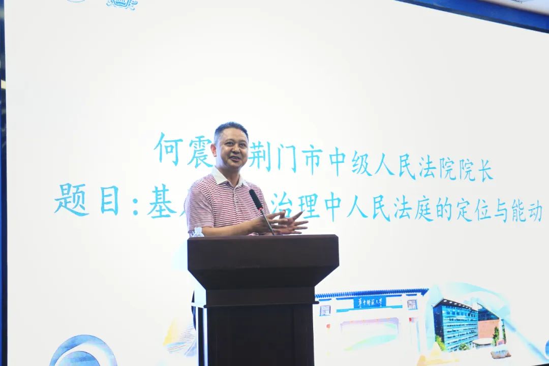 在论坛第一单元,有四位校友发言。荆门市中级人民法院院长何震作题为《基层社会治理中人民法庭的定位与能动》的主旨发言。他强调了人民法庭在基层社会治理中的重要作用,并就如何开展“四融共建”进行了深入阐述。他提出,人民法庭应主动融入基层社会治理,积极参与无讼村居建设,注重多元化纠纷调解。他还就当前基层法治困境提出化解之道。