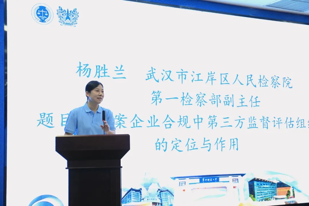 武汉市江岸区人民检察院第一检察部副主任杨胜兰作题为《涉案企业合规中第三方监督评估组织的定位与作用》的主旨发言。她指出,涉案企业合规中第三方组织的角色定位于监督、评估和指导。全面、客观和专业是合规考察书面报告的必备要素。