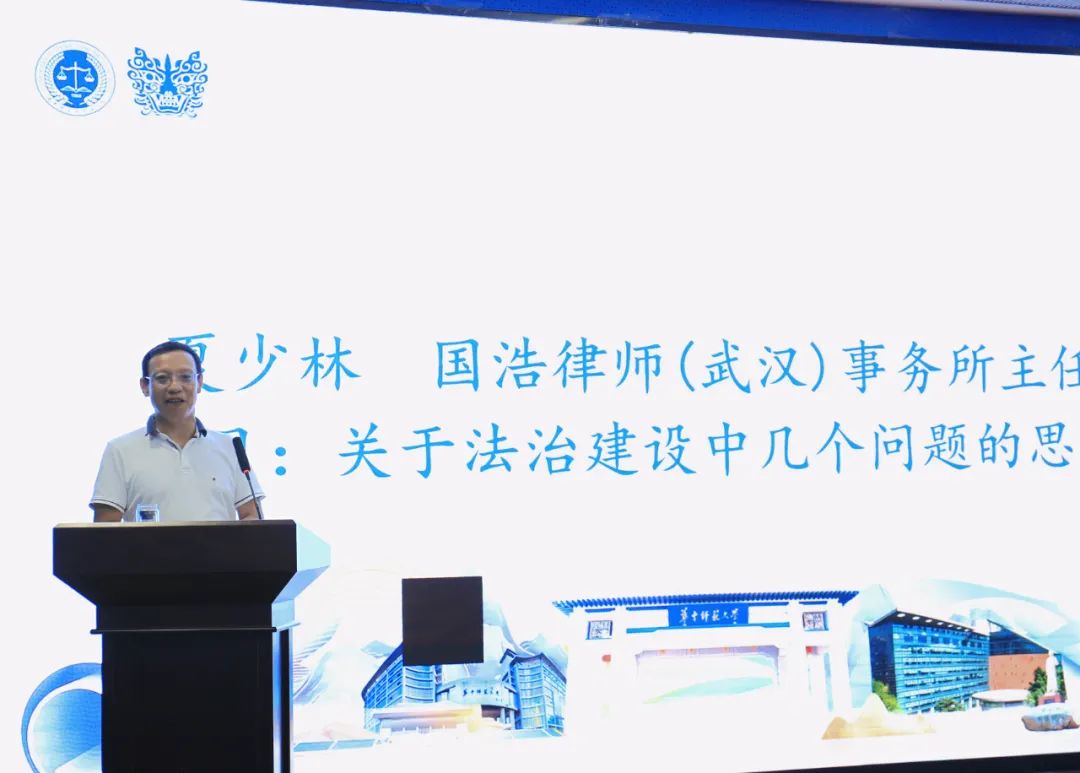 国浩律师(武汉)事务所主任夏少林作题为《关于法治建设中几个问题的思考》的主旨发言。他认为,法的边界上存在“口袋”法条多、自由裁量权过大等问题;结合“鼠头变鸭脖”和“高铁互殴”事件,他认为应当加强对社会舆论的规范和引导,使它能够发挥正确的监督作用。