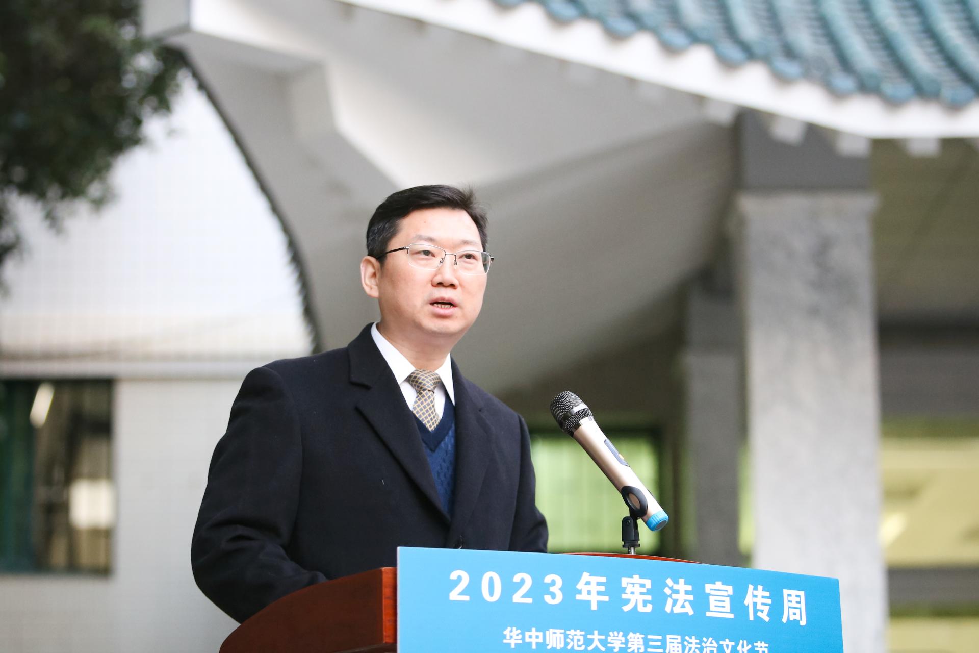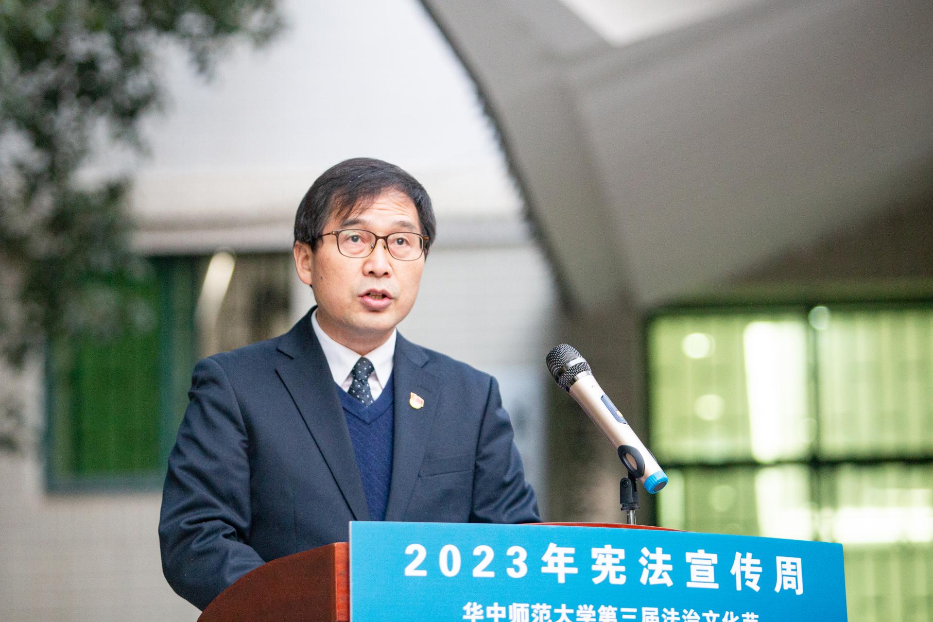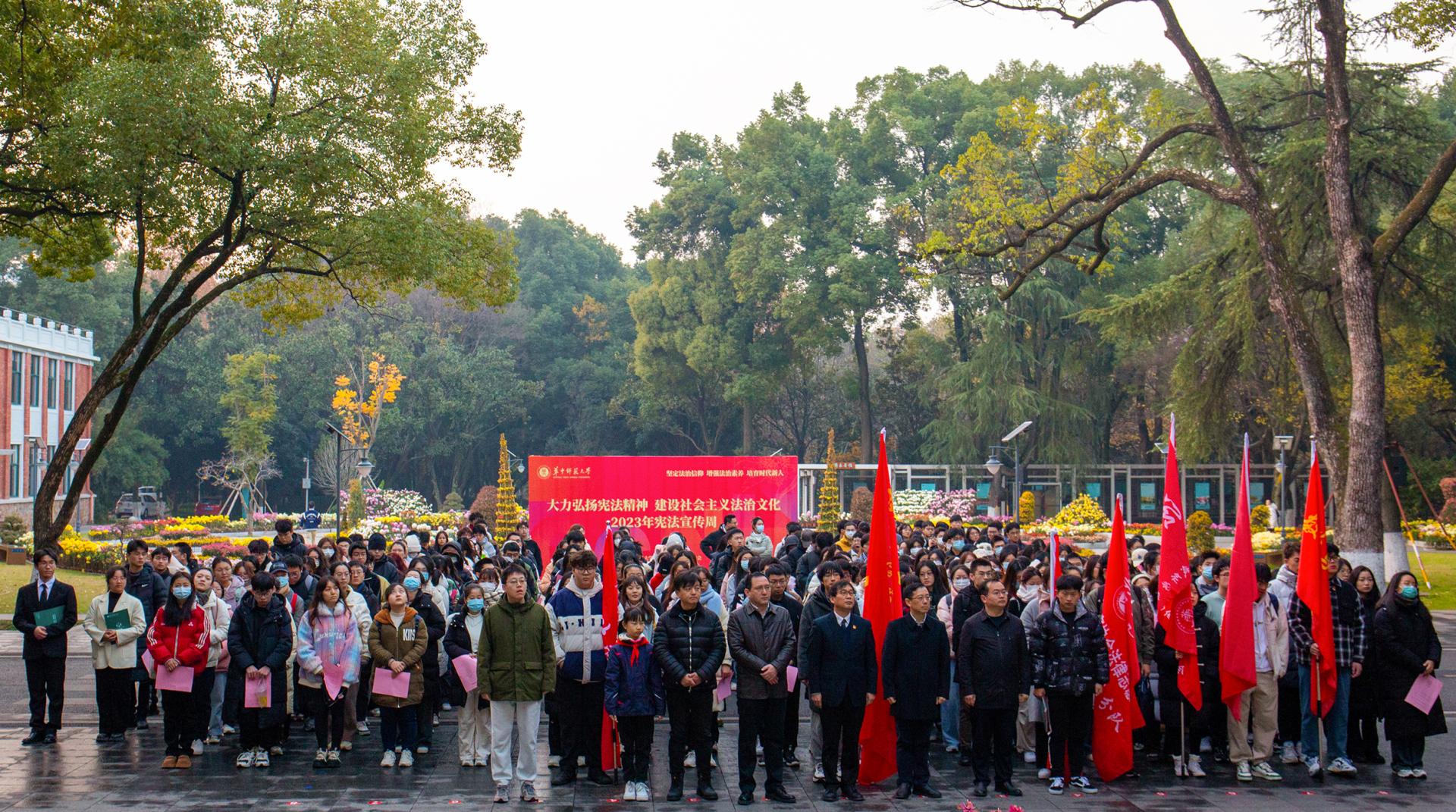 任友洲在致辞中指出,我校历来高度重视宪法宣传和教育工作,注重发挥法学学科优势,创新法治宣传教育方式方法,将法治文化融入到校园文化建设,引导广大师生树立法治观念、培养法治思维、坚定法治信仰,把尊法、守法与爱党、爱国紧密结合起来,努力做中国特色社会主义法律体系的忠实崇尚者、自觉遵守者、坚定捍卫者,形成了独具特色的校园法治文化和法治宣传教育模式。为进一步增强学校师生宪法意识、弘扬宪法精神,他希望学校全体师生积极带头学习宪法、宣传宪法、遵守宪法,让宪法精神根植心底,让宪法意识蓬勃生长,为建设中国特色世界一流大学提供法治保障,为实现第二个百年奋斗目标、实现中华民族伟大复兴的中国梦作出新的更大贡献。