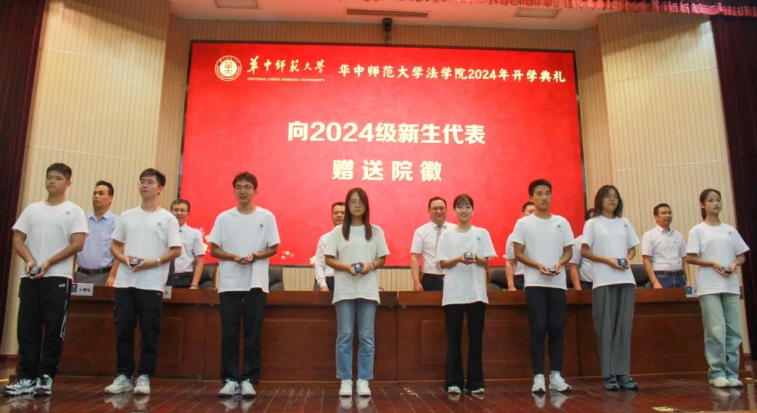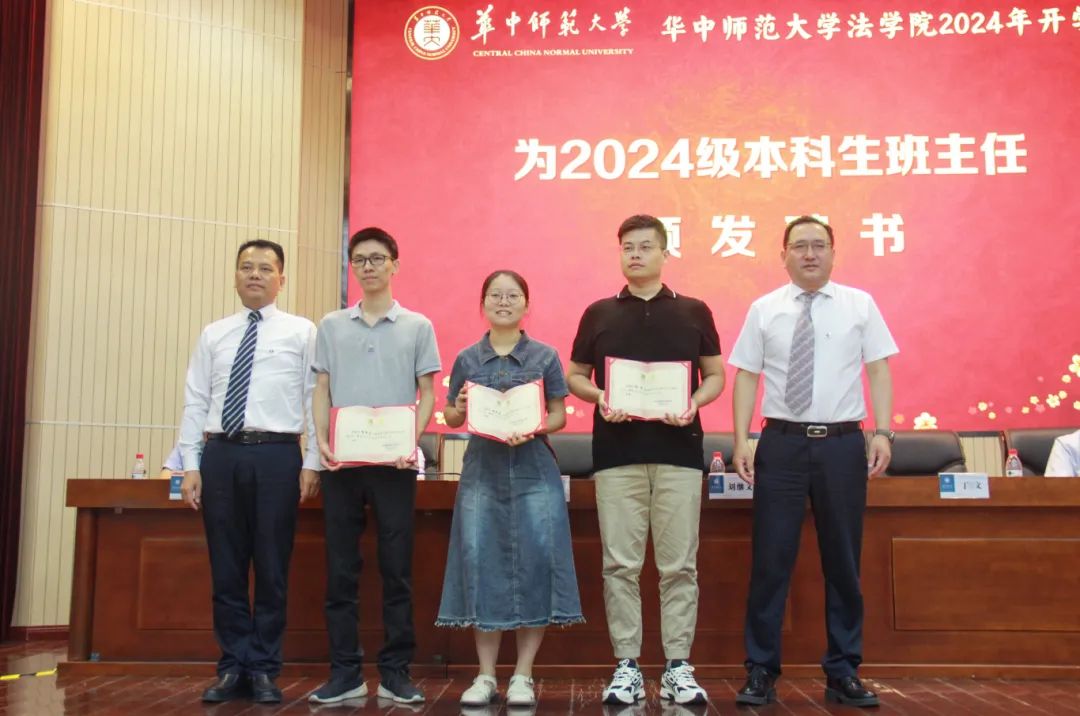 刘继文和丁文为2024级本科生班主任颁发聘书,主席台就座的领导嘉宾向新生代表颁发院徽并合影留念。