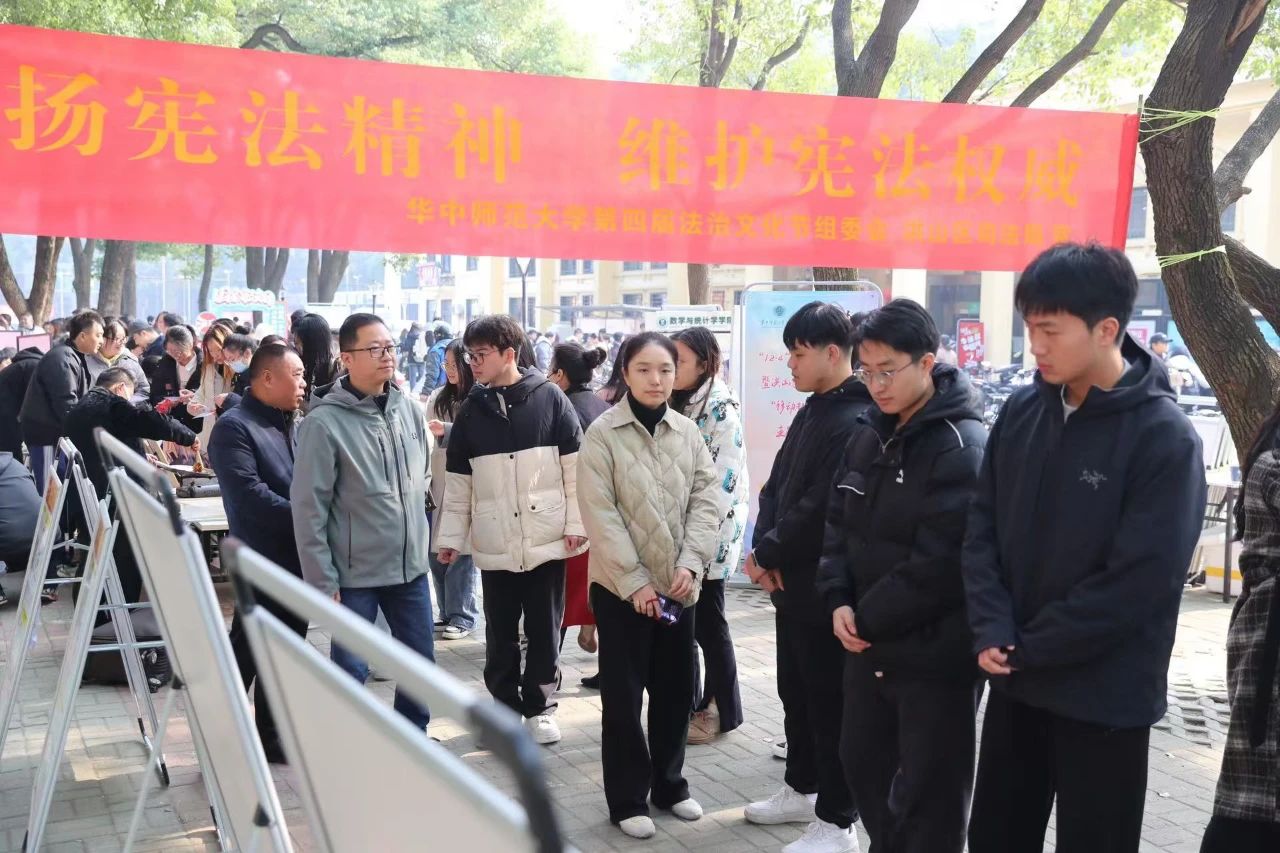 12月3日,国家宪法日法治游园会在东区小树林与东十八宿舍楼下举行,洪山区委常委、区委宣传部部长邵峰,区委宣传部副部长廖红艳,区司法局党组书记、局长刘海情,区司法局党组成员、副局长熊远峰等洪山区委、洪山区司法局领导莅临现场,星空(中国)党委书记杨臣、党委副书记万枞、副院长肖登辉、文杰,以及星空(中国)教师石先钰、王勤、朱良,团委书记张永基、副书记何青苗等出席游园会。活动现场人声鼎沸,气氛热烈,吸引不少华师学子踊跃参加。